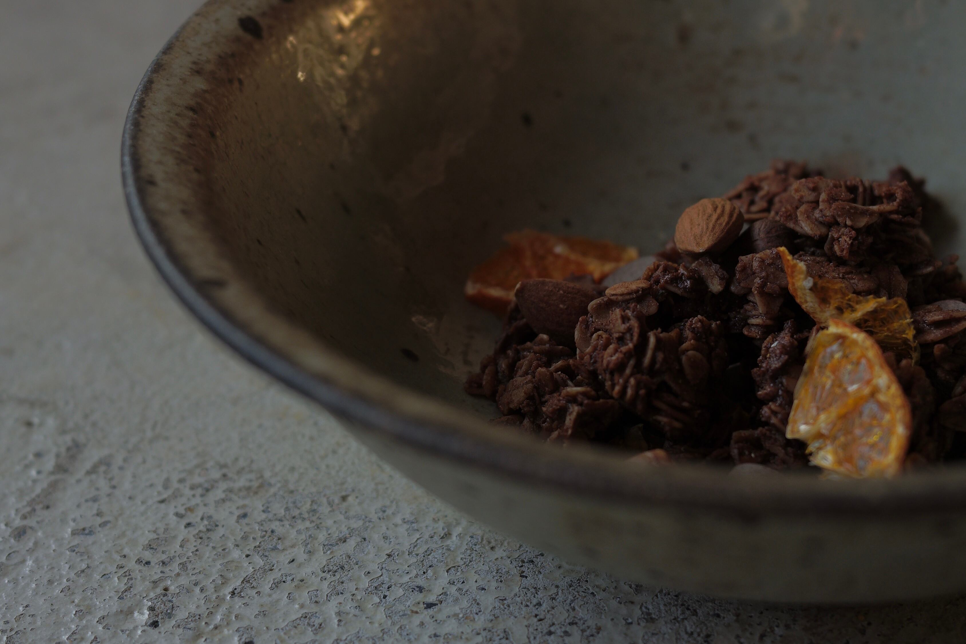 冬限定、香りの良い有機カカオを使った香ばしくビターな味わいのグラノーラ。今年はカカオと相性の良い瀬戸田蜜柑を組み合わせて。カカオ70%チョコレートやカカオニブ、アーモンドやヘーゼルナッツなども入れて、食感も楽しいグラノーラです。