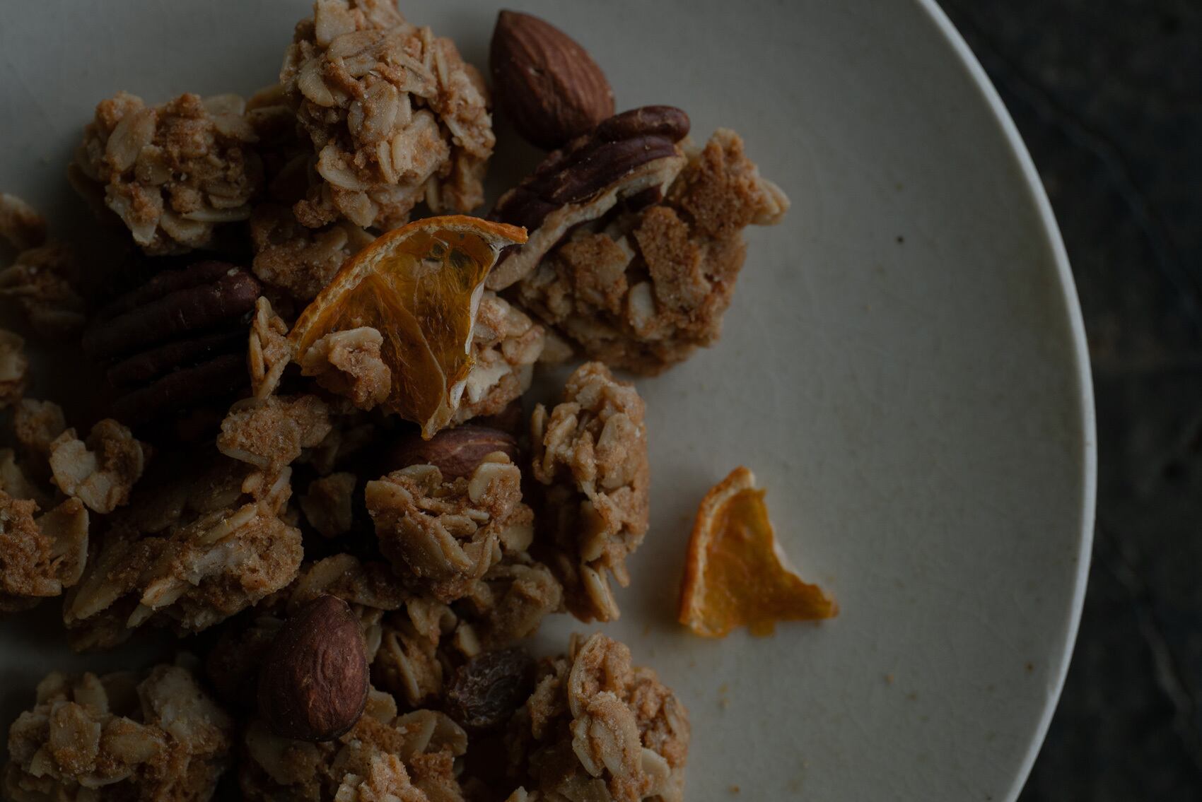 メープルシロップと玄米塩麹のかろやかで深みのある味わいのグラノーラ。広島県尾道市瀬戸田産の味の濃い蜜柑をドライにして、アーモンドやピーカンナッツを合わせています。